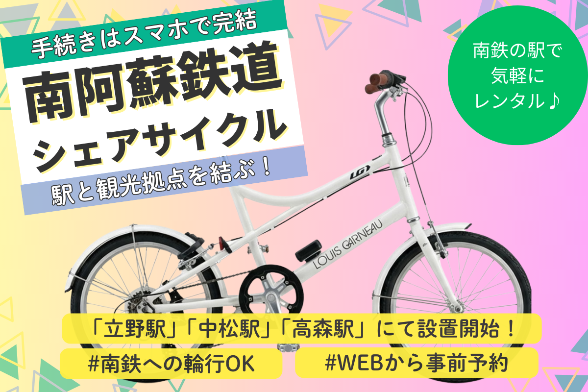 南阿蘇村内の主要な駅を拠点として、自由に自転車(ミニベロ)を借りたり返したりできる「南阿蘇シェアサイクル」のサービスが2/28~始まります。
