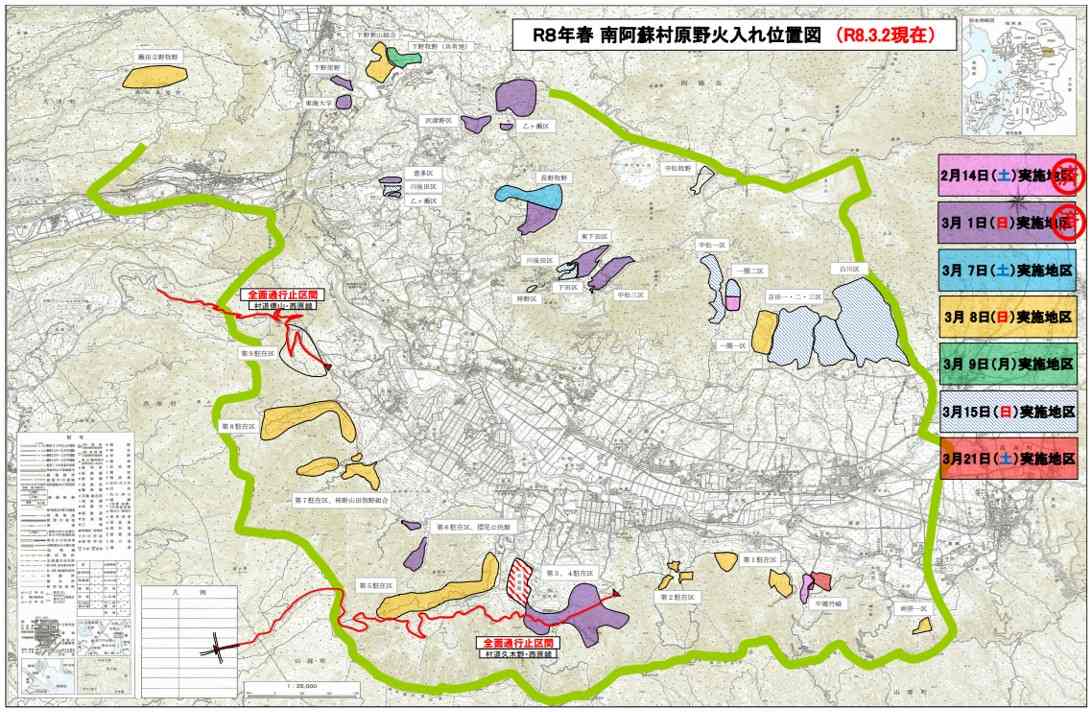 2026年春の阿蘇エリア『野焼き』の実施予定です(画像は3月2日時点の南阿蘇村の実施計画です)。