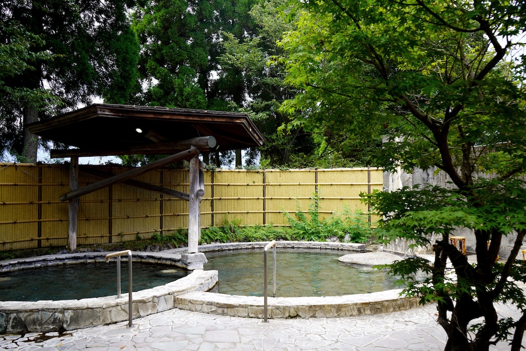 深い緑、”利久色”に染まる濁り湯が特徴。露天タイプの大浴場のほか、10ある家族湯は毎回お湯を入れ替え。いつでも一番湯が楽しめる、と人気です。
