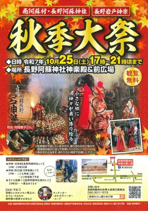 | 主催・お問い合わせ | 長野阿蘇神社 秋季大祭 実行委員会 TEL:090-3011-1572 |
