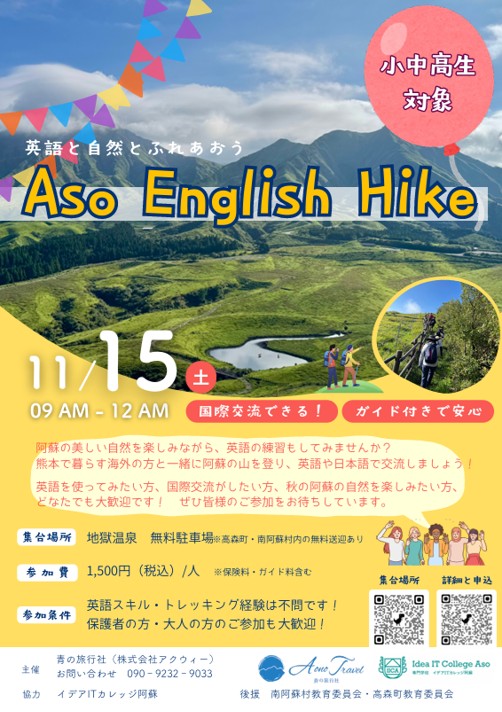 英語を使ってみたい方、国際交流がしたい方、秋の阿蘇の自然を楽しみたい方、どなたでも大歓迎です!
