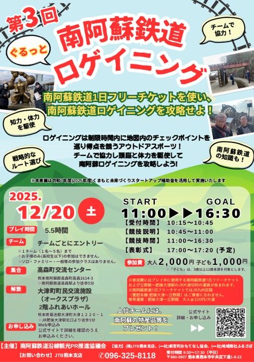 - 2025年12月20日(土)、南阿蘇鉄道沿線エリア(大津町・南阿蘇村・高森町)にて「第3回 ぐるっと南阿蘇鉄道ロゲイニング」が開催されます。