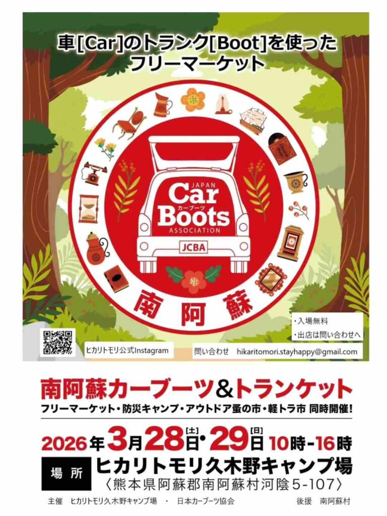 - 2026年3月28日(土)・29日(日)、ヒカリトモリ久木野キャンプ場にて「南阿蘇カーブーツ&トランケット」が開催されます。