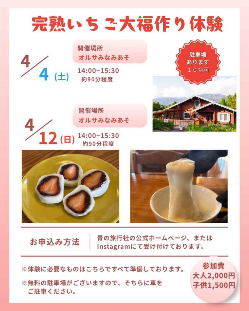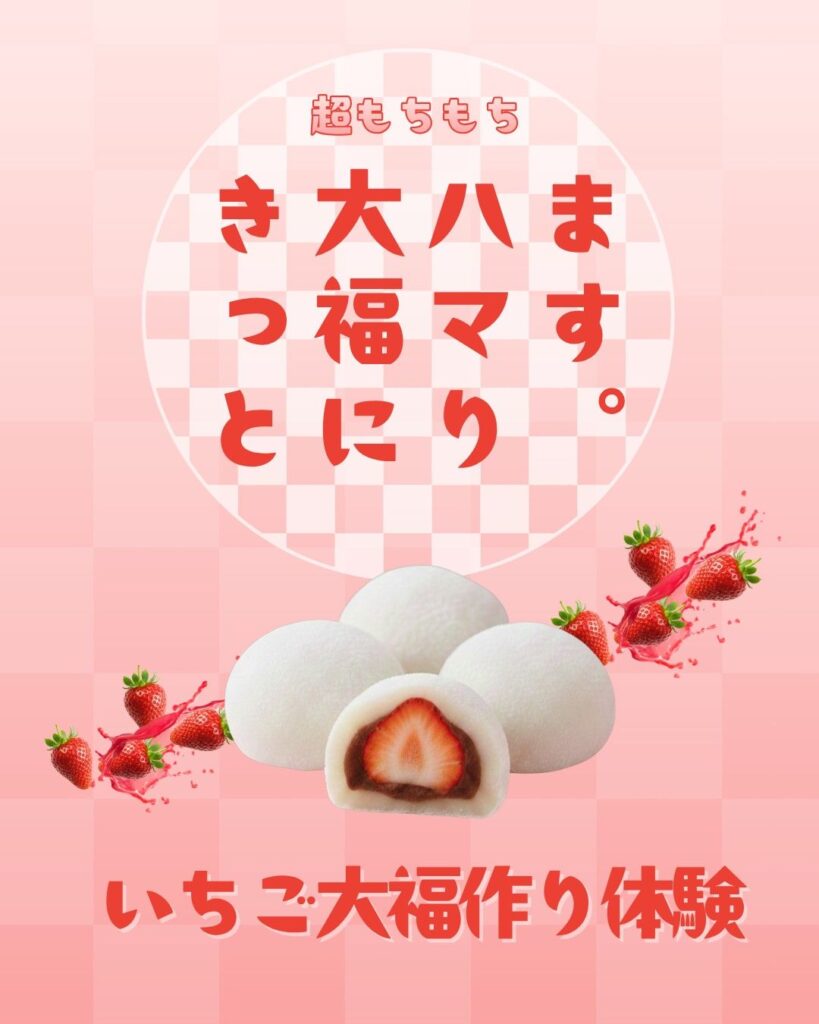 - 2026年4月4日(土)・12日(日)、オルサみなみあそにて「完熟いちご大福作り体験 ~超もちもち きっと大福にハマります~」が開催されます。