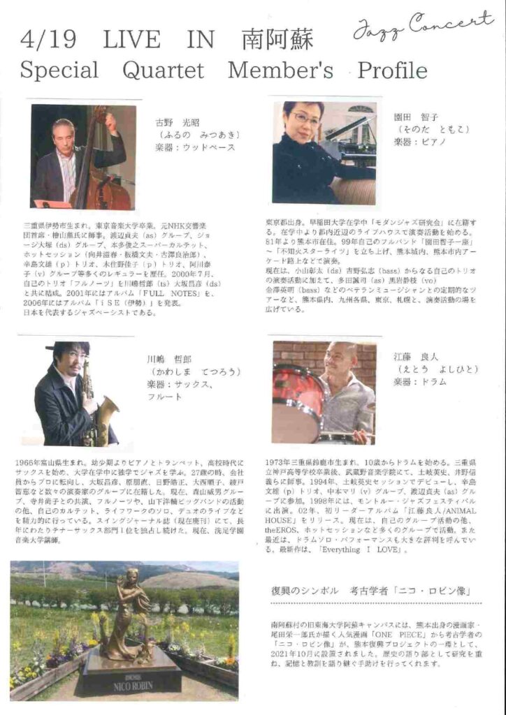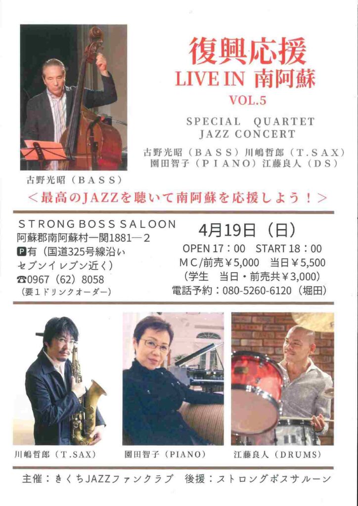 - 2026年4月19日(日)、ストロングボスサルーンにて「復興応援LIVE IN南阿蘇 Vol.5 -SPECIAL QUARTET JAZZ CONCERT-」が開催されます。