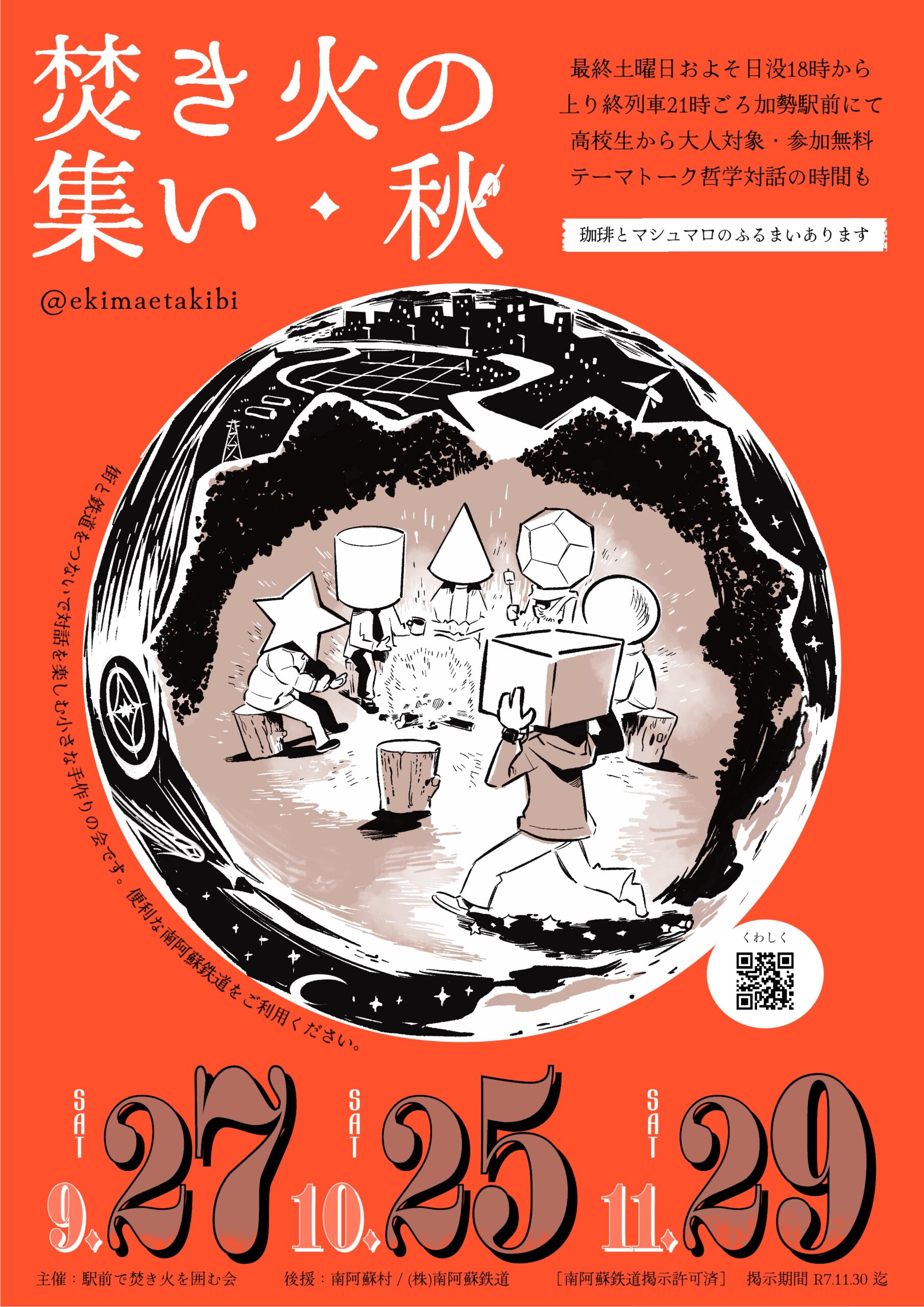 - 2025年9月27日(土)と10月25日(土)と11月29日(土)、南阿蘇村にて「焚き火の集い・秋」が開催されます。