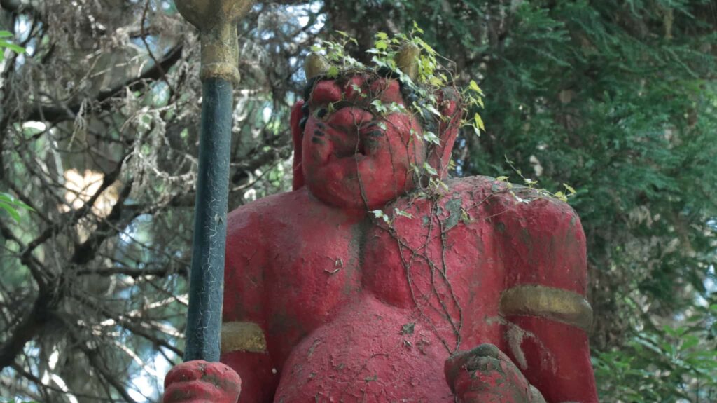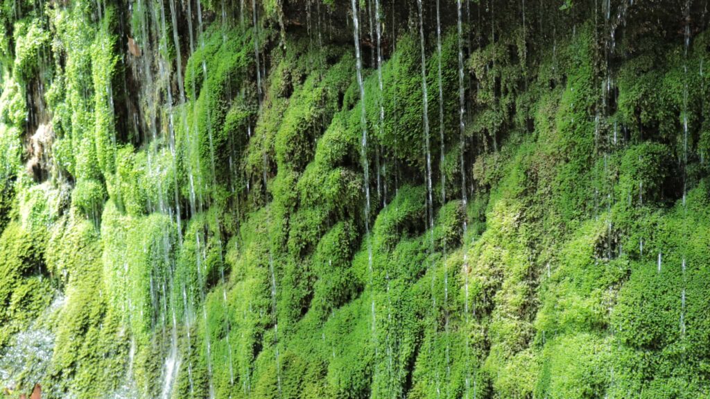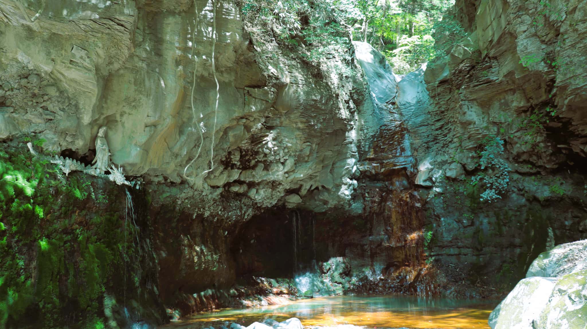 渓谷側面の岩場もあり、3m程の崖上部からほとばしる細流は、みどりの苔を伝わって10mほどのカーテンシャワーを作ります。また、長さ50m程の溶岩洞穴には、諸々の神仏が祭られています。