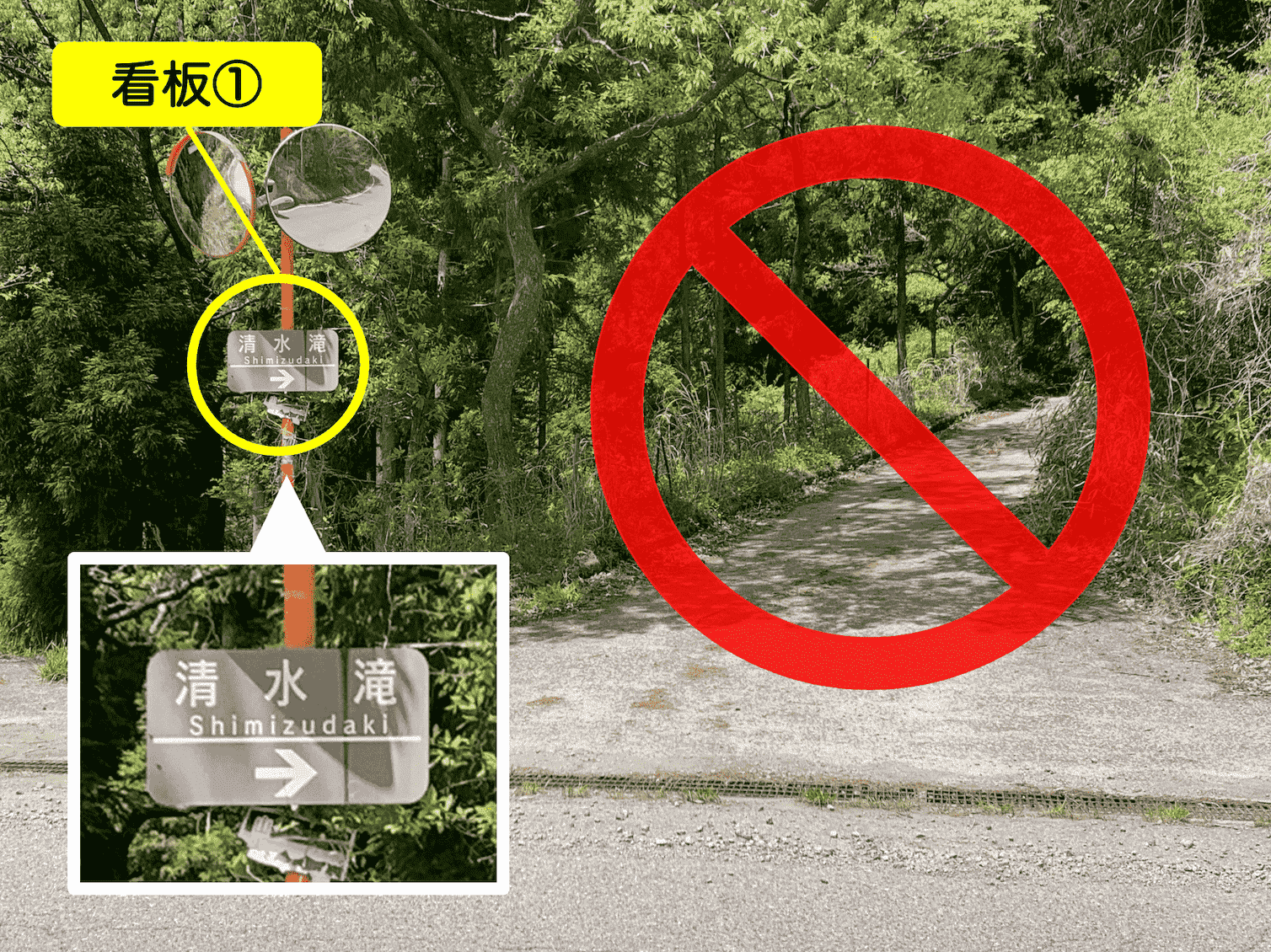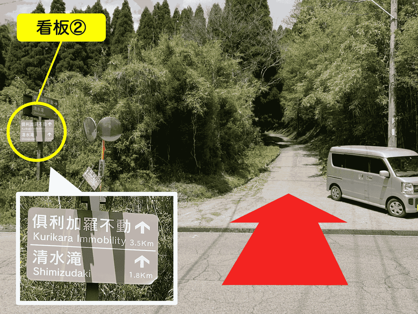 2. 農免道路を道なりに進み、左側の「看板①」では曲がらずに「看板②」を目印に左折。
