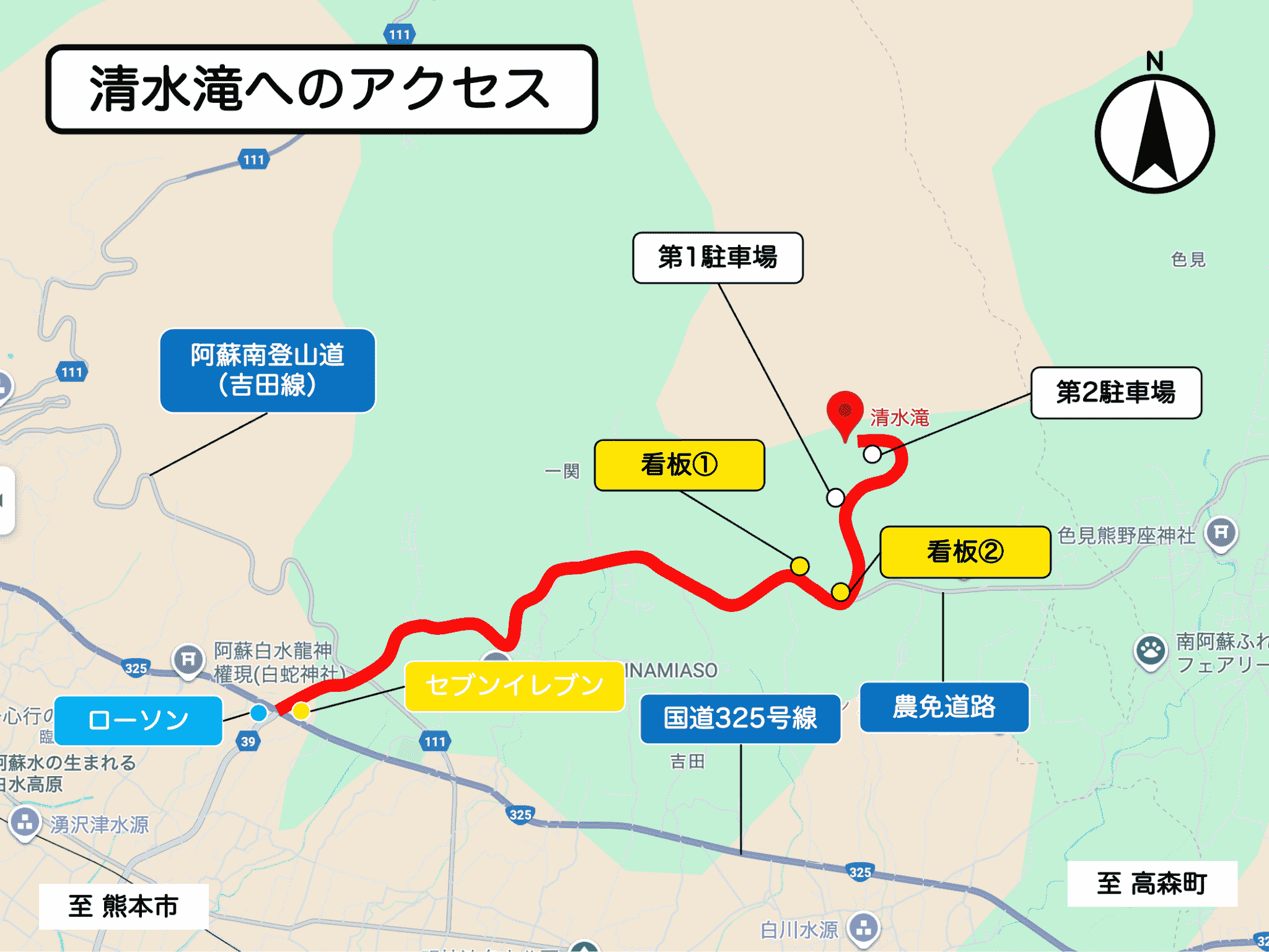 1. 国道325号線の「ローソン」と「セブンイレブン」がある交差点を阿蘇山方面に曲がり農免道路に入る。
